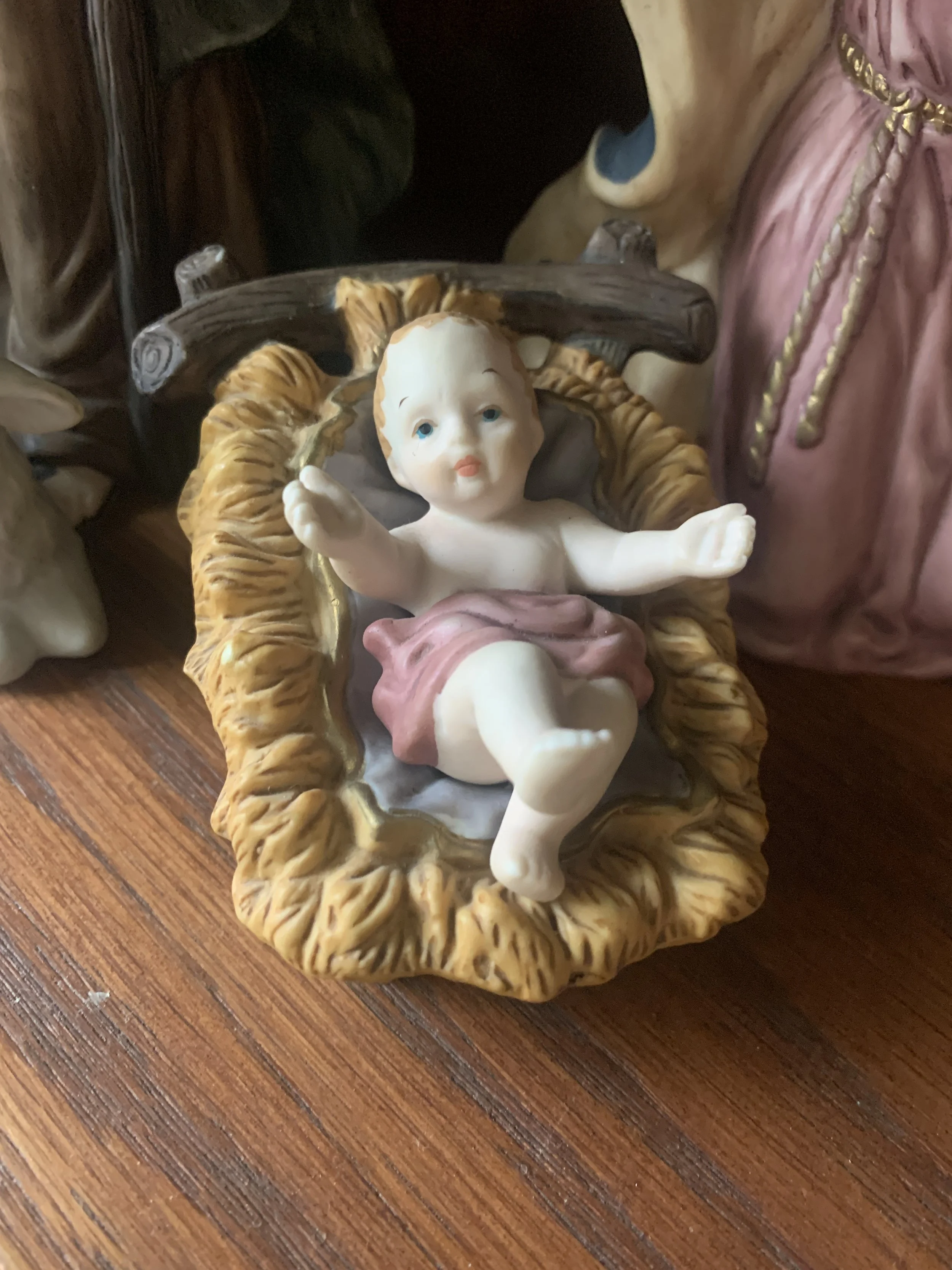 We gaze at a newborn baby, nestled in straw in the most humble of cribs